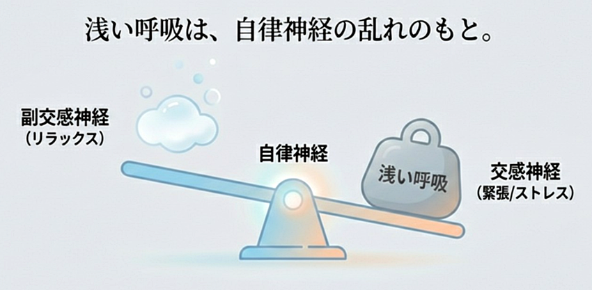 呼吸が浅い状態では交感神経が優位になりやすく、胃腸の働きや血流にも影響が出ます。